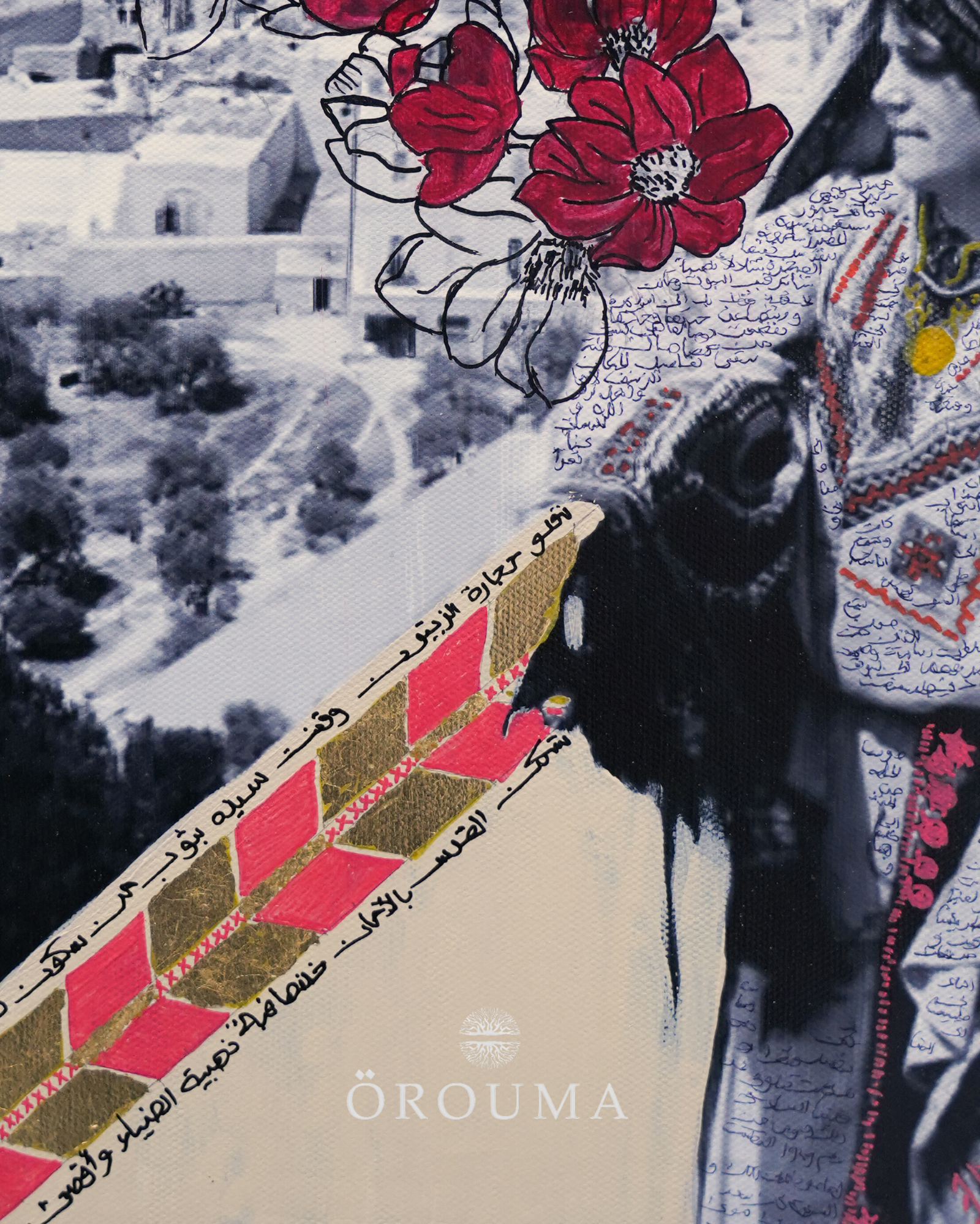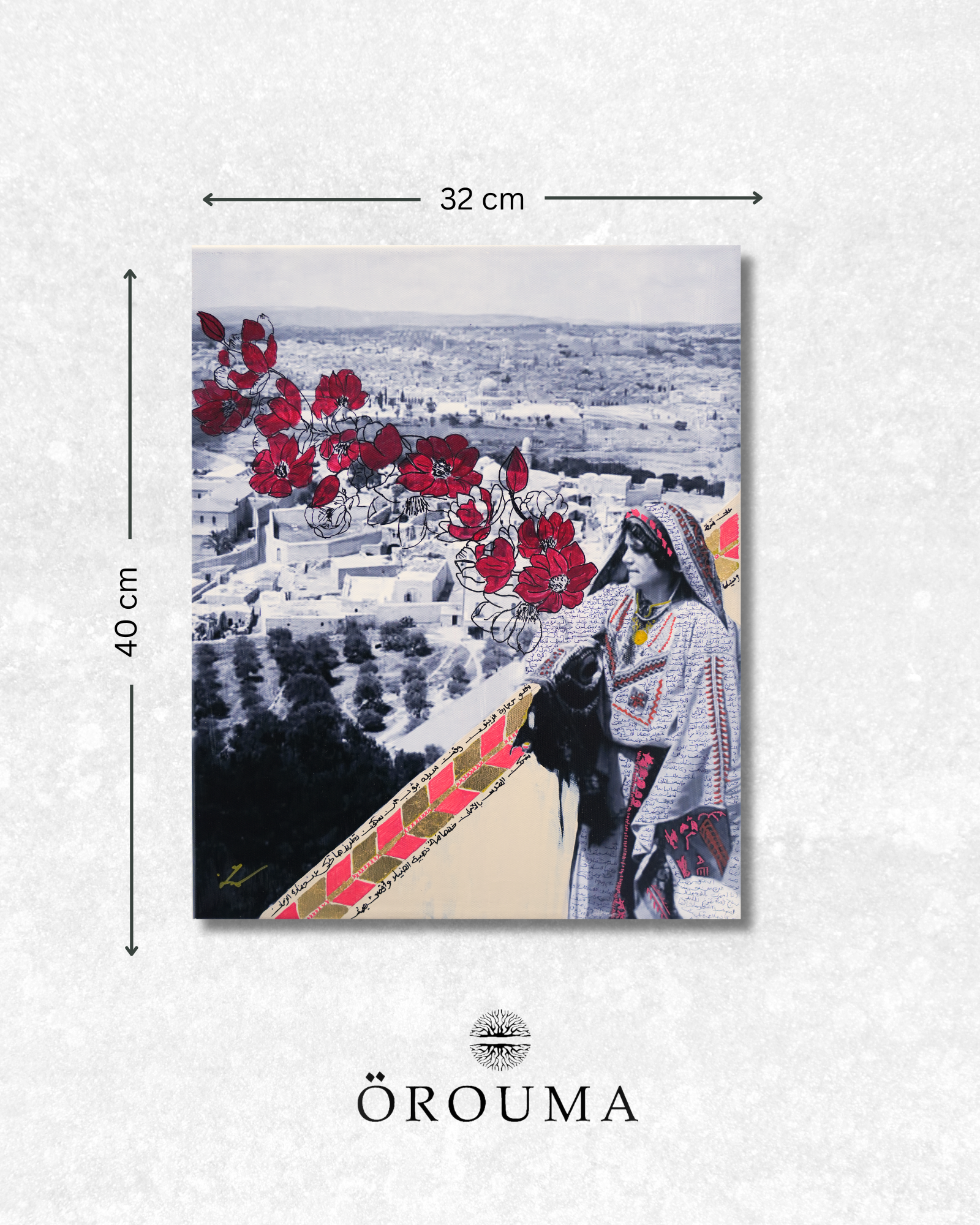 Clothed in intricate Palestinian embroidery, a Jerusalemite woman stands on her balcony in Hai Al Zaytoon (the Olive Quarter), her eyes fixed on the sacred cityscape that stretches before her. The Dome of the Rock and Al-Aqsa Mosque rise in the distance, framed by the ancient stone walls and olive groves below. Red anemones bloom like memories across the image, merging the present with the eternal. This piece evokes the strength and serenity of a woman rooted in her land, whose quiet gaze holds centuries of belonging, beauty, and resilience in the heart of Jerusalem.
