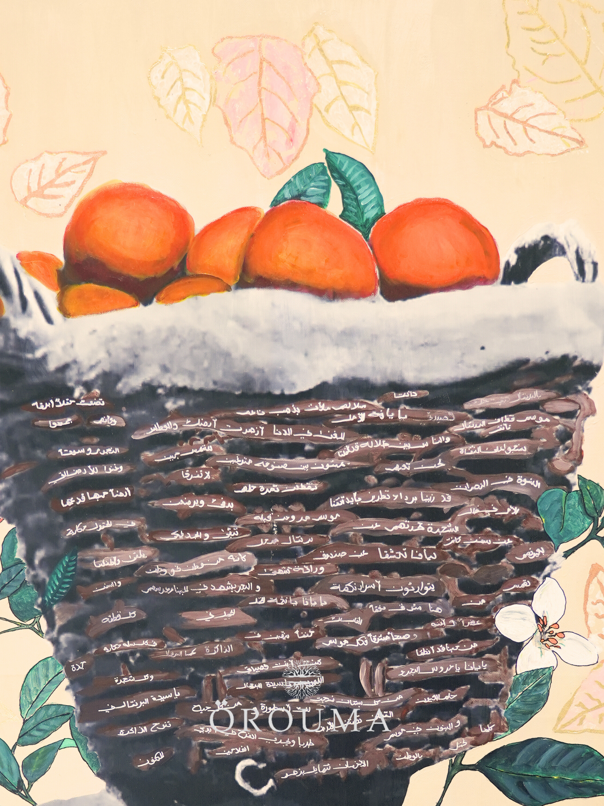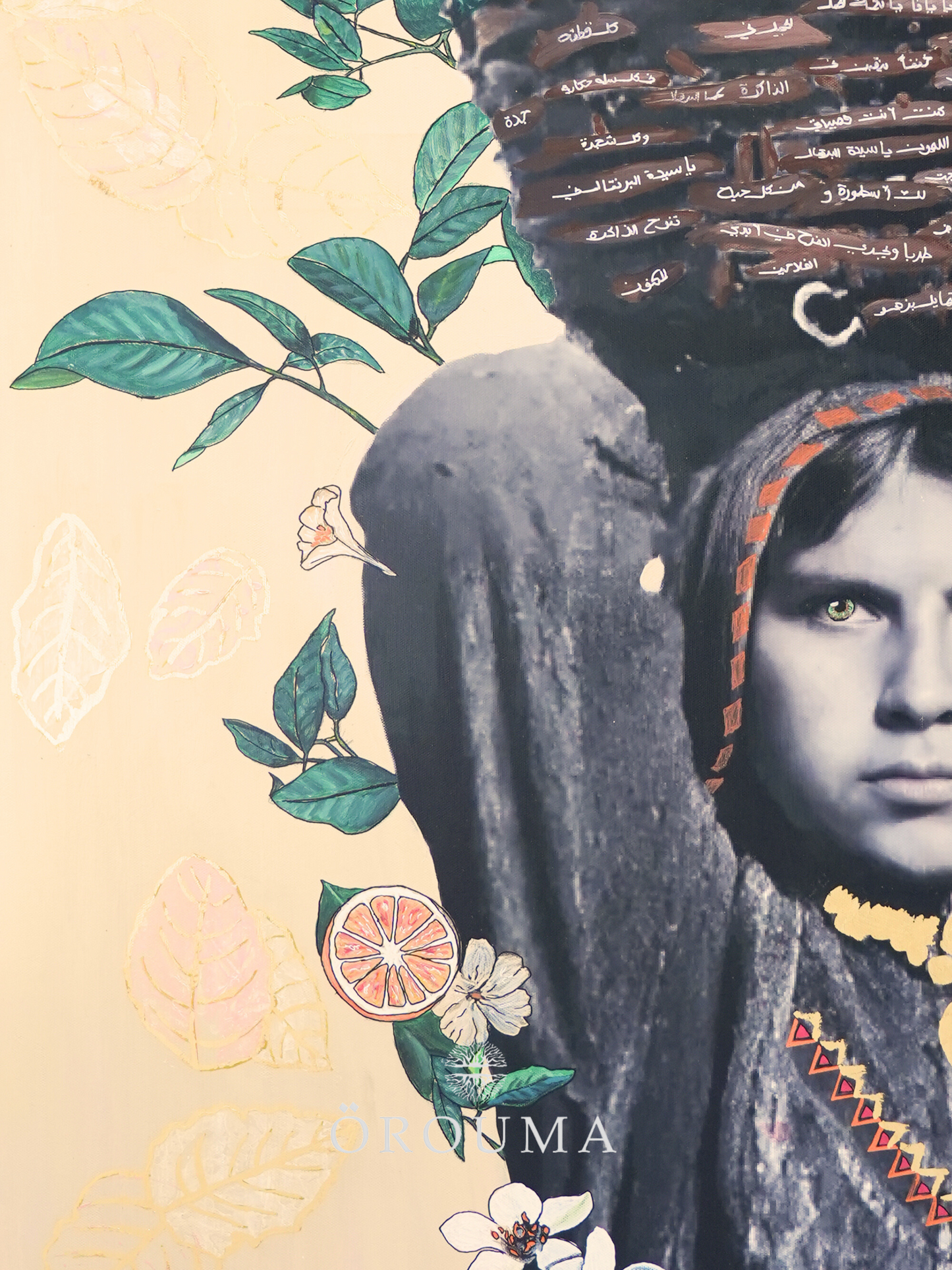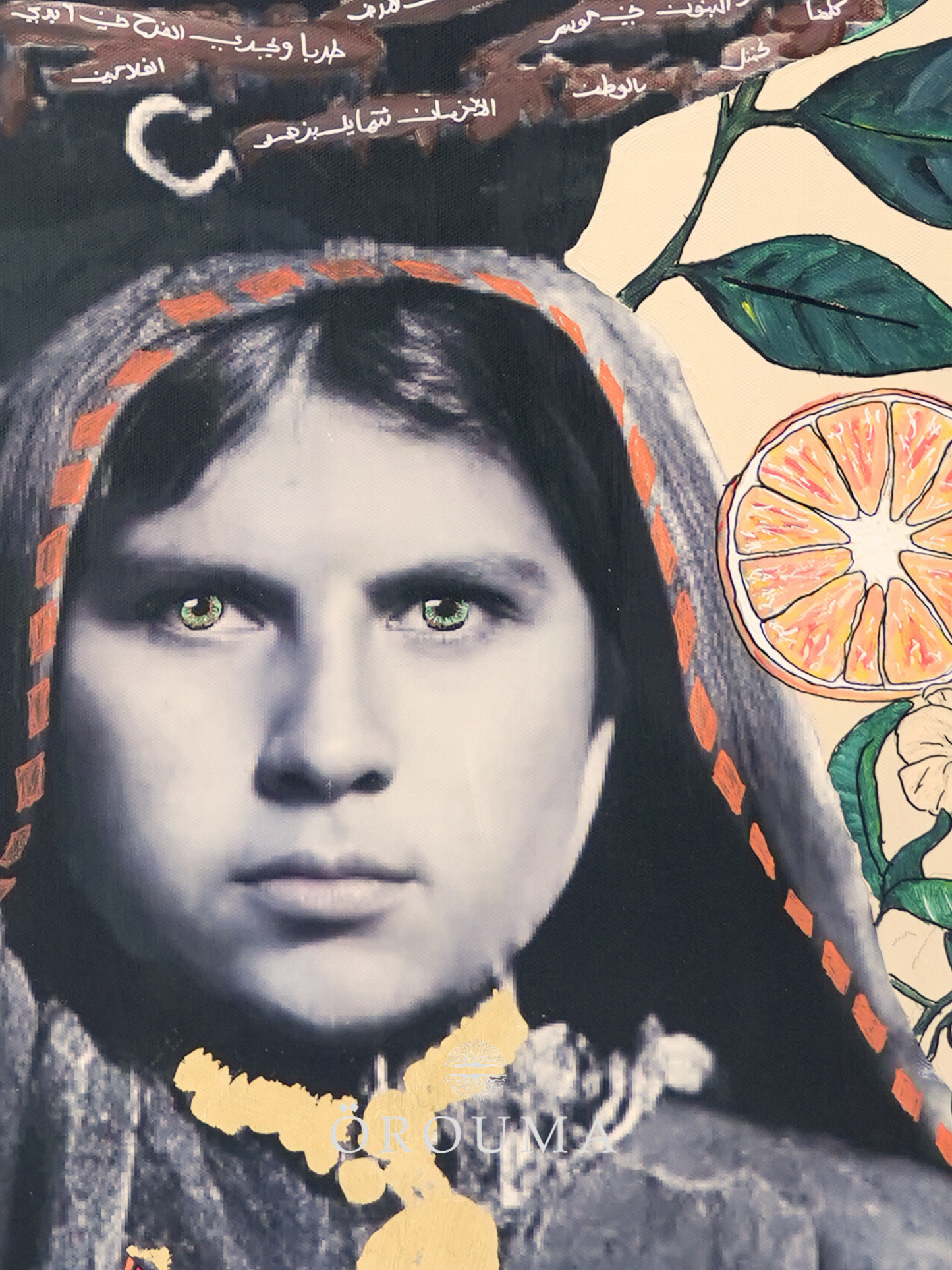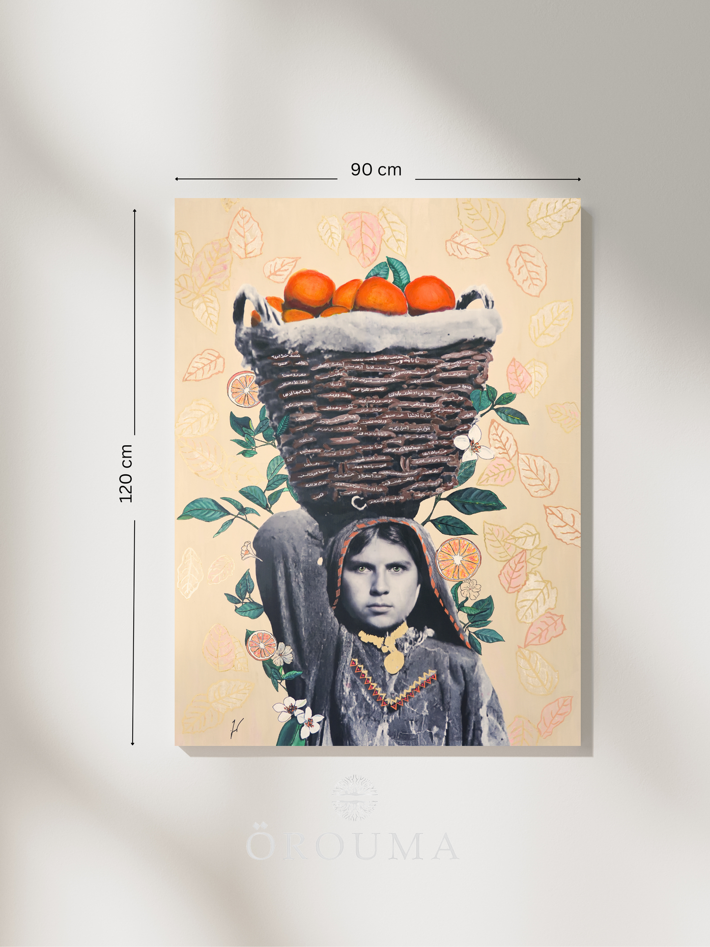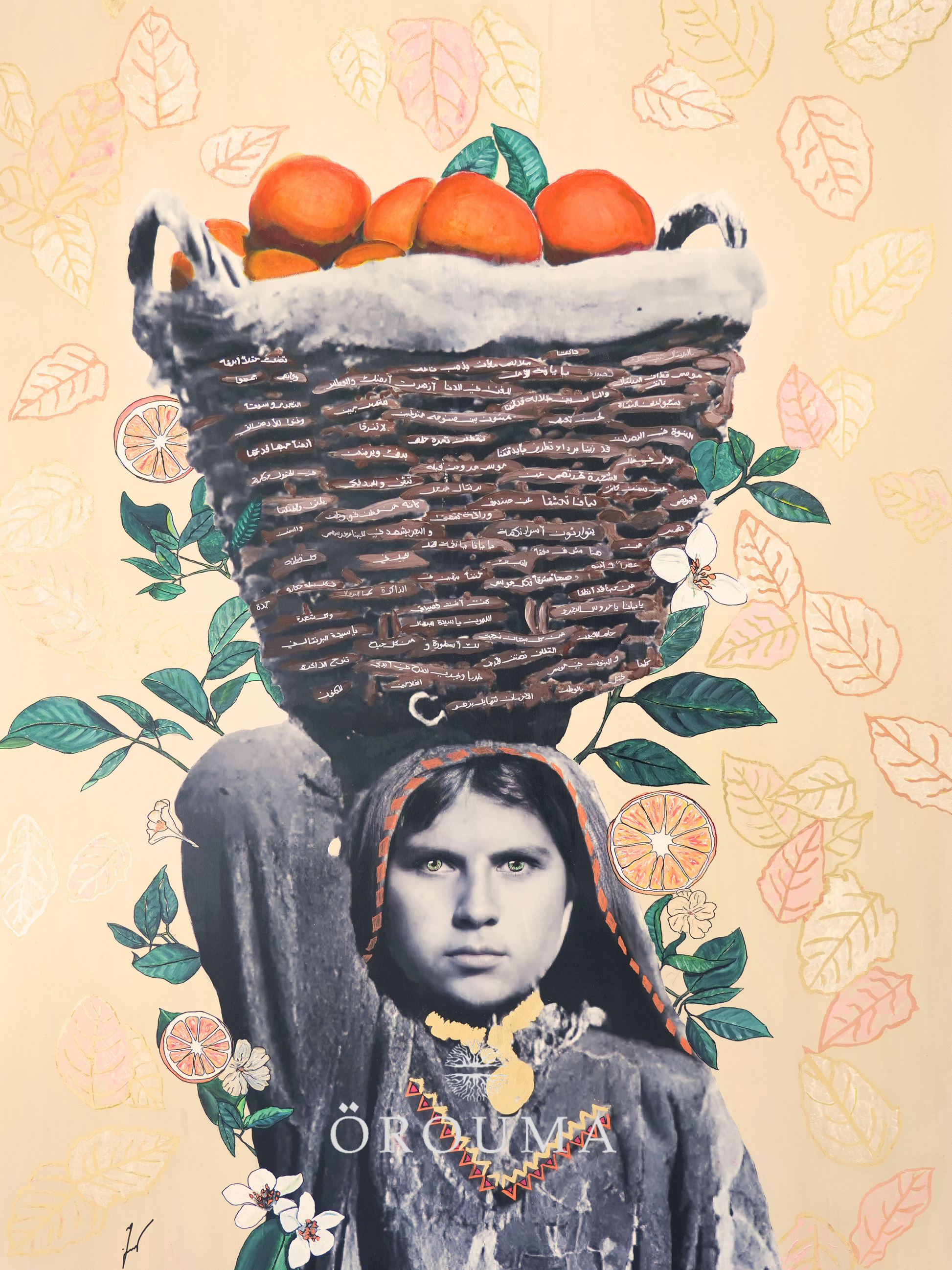 In this evocative portrait, a young girl from Yafa stands tall beneath the weight of a woven basket brimming with oranges—Palestine’s most fragrant pride. Her gaze is unwavering, embodying both the tenderness of the orchard and the quiet strength of a land rooted in resilience. Surrounding her, painted blossoms and citrus slices echo the scent of springtime harvests and the vibrant legacy of Yafa’s groves. This piece is more than a glimpse into a season; it’s a tribute to generations who nurtured the land with bare hands and carried its fruits with hearts full of dignity.