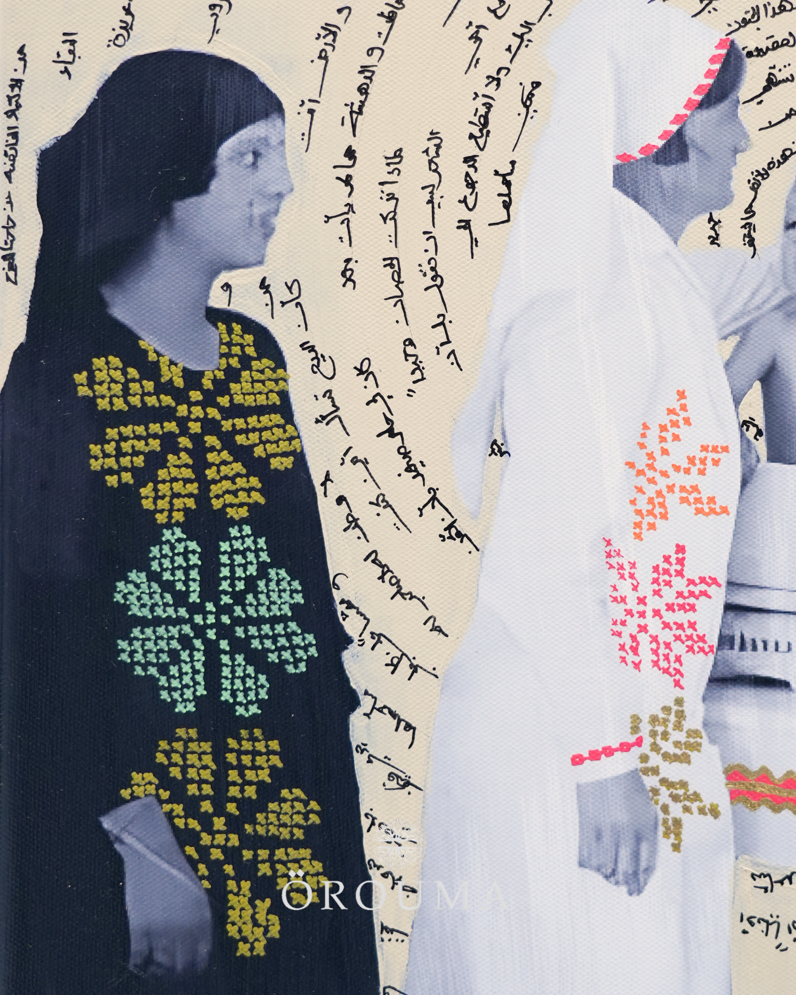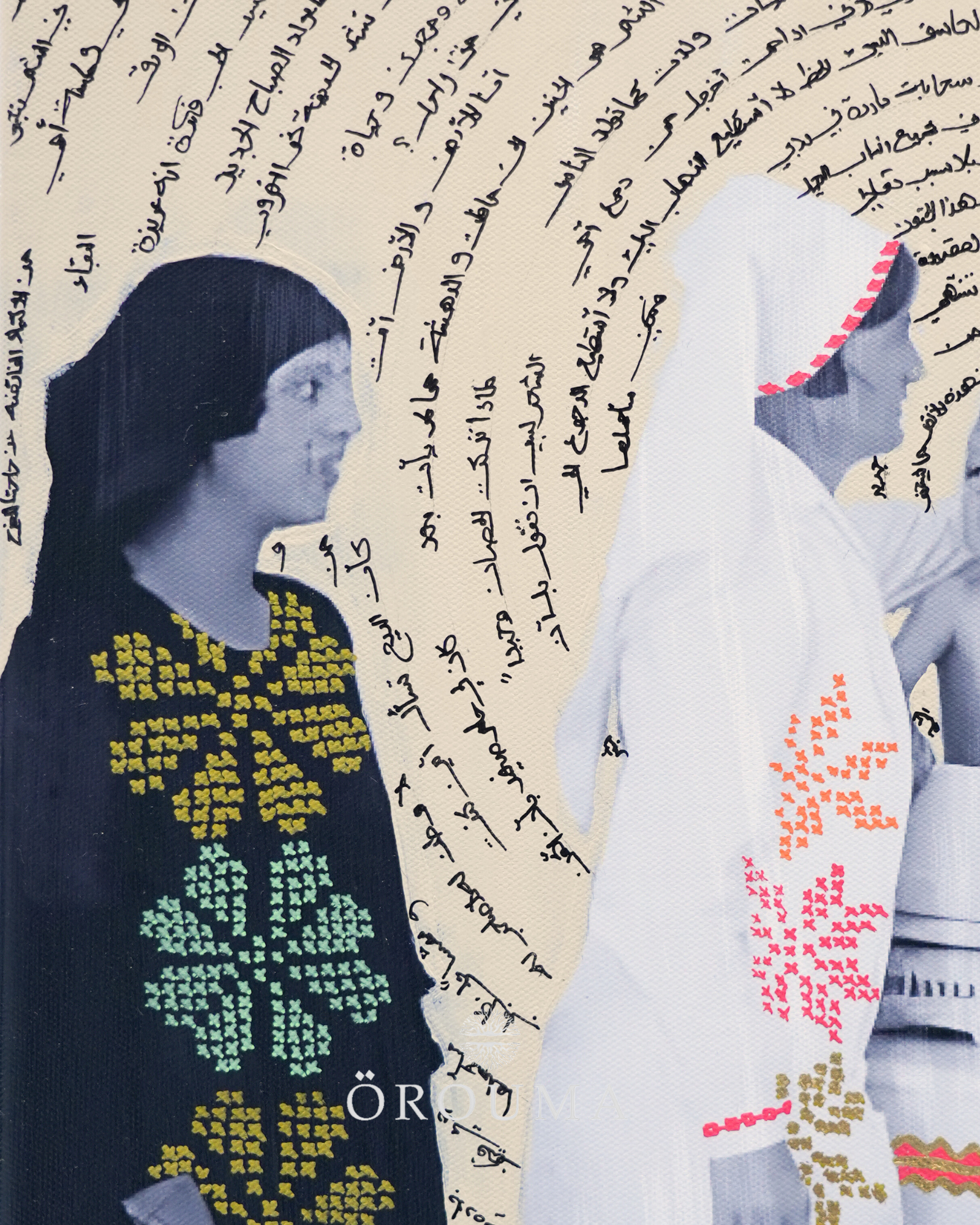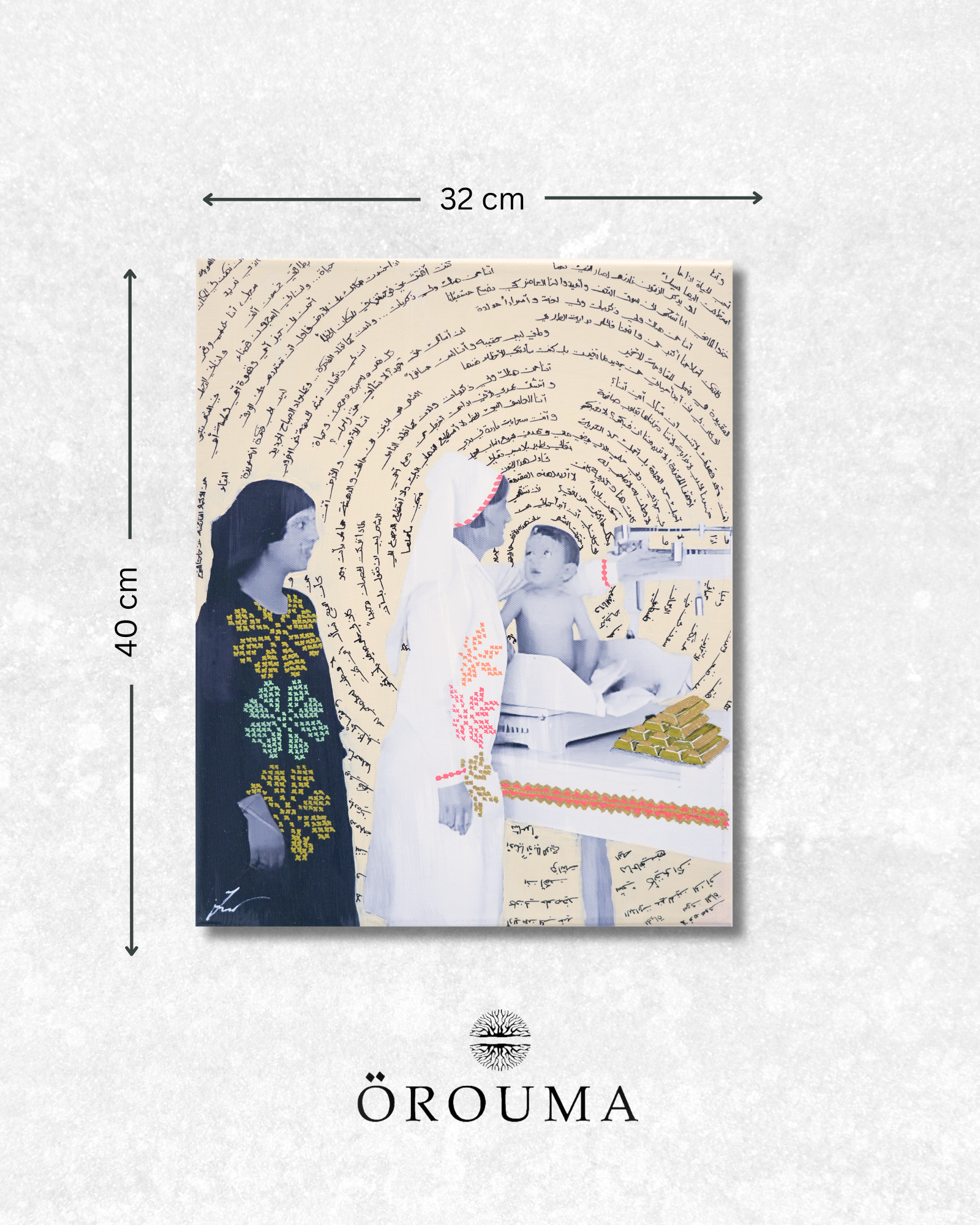 In this poetic portrayal, we witness a tender moment in a Haifa hospital in 1942—Mahmoud Darwish, not yet a poet, just a child on a scale. But the scene hints at the weight of what he would carry: verses that would echo across generations. His mother watches closely, her presence firm and loving, while the nurse gently tends to him. Around them spirals handwritten script—words like gold dust, already forming the rhythm of a future legend. Here, Darwish is not weighed by flesh alone, but by the promise of poetry and Palestine.