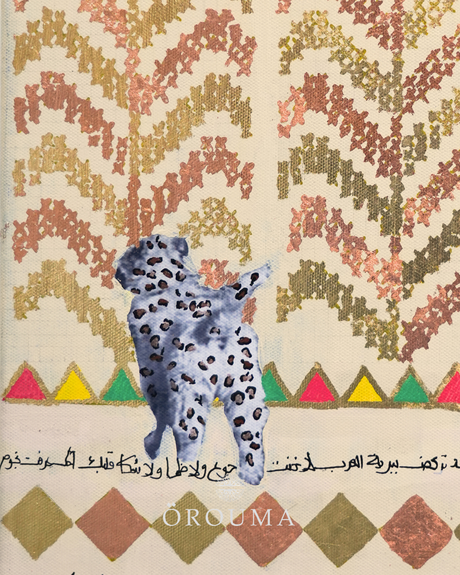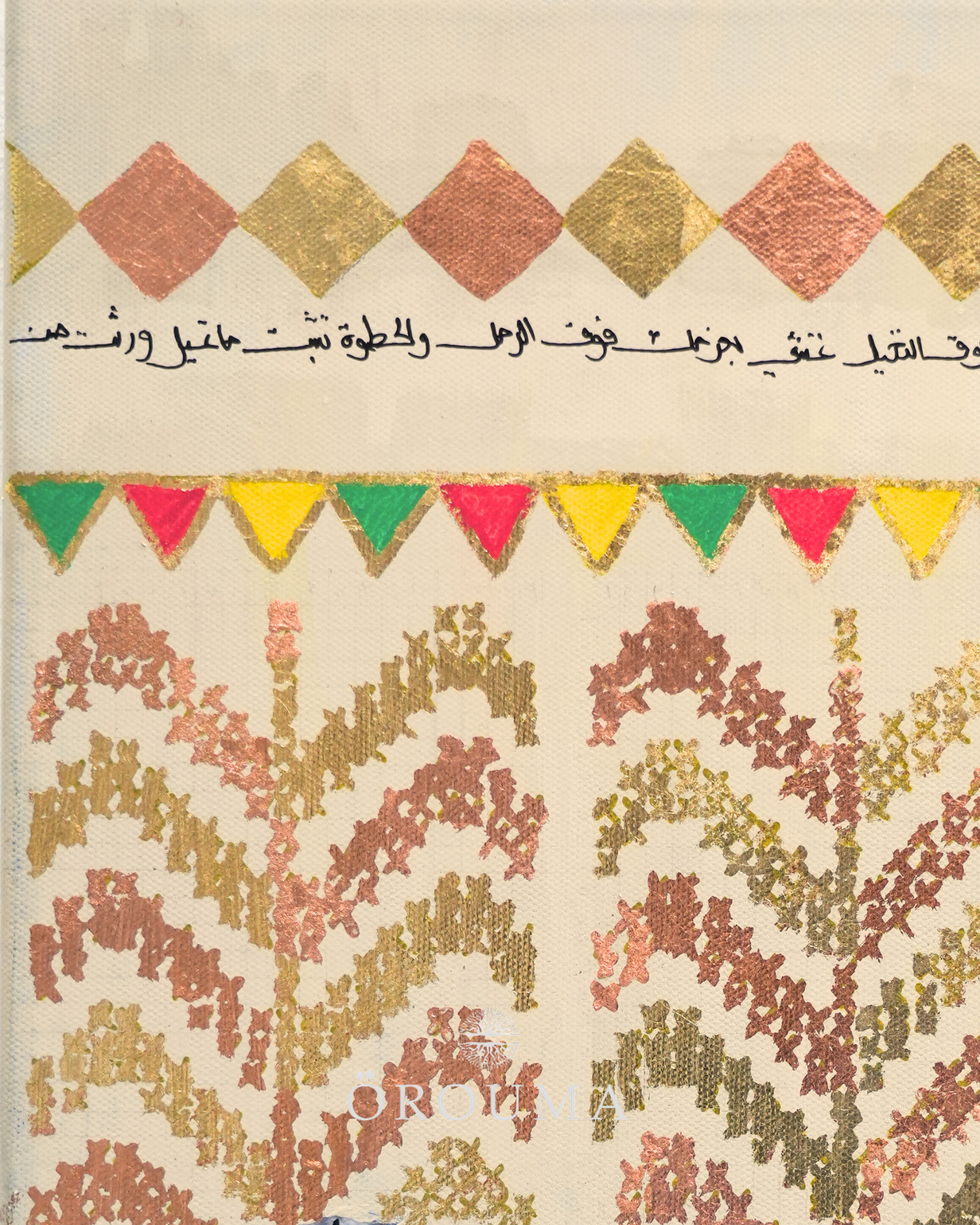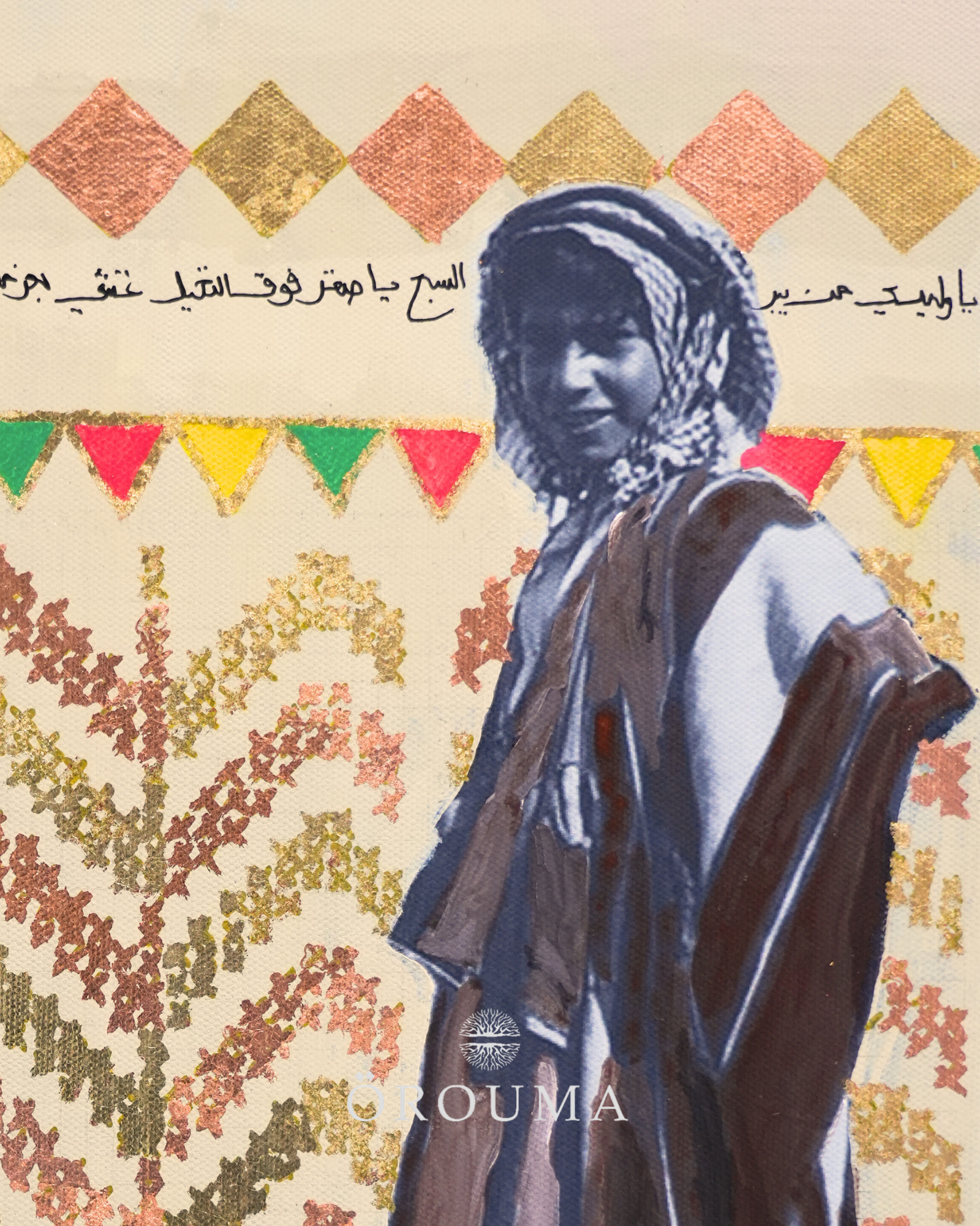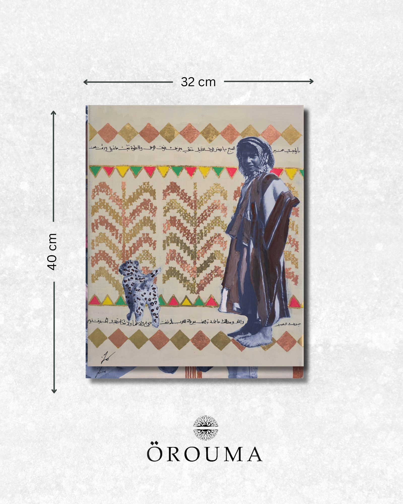 In the vast golden stretches of the Naqab desert, a barefoot Bedouin boy stands wrapped in his traditional cloak, a quiet symbol of resilience and belonging. Beside him, a small puppy mirrors his stance, alert and loyal—two companions rooted in the land’s enduring rhythm. Behind them, geometric patterns echo tribal identity, while colorful flags hint at celebration and spirit. This tender moment, captured in 1938, weaves innocence with strength, solitude with connection. Through embroidery, ink, and earth-toned hues, the piece pays homage to the bond between people, place, and the pure language of companionship.
